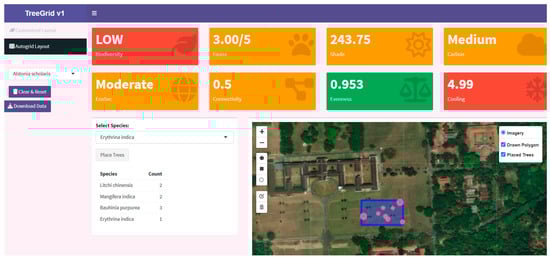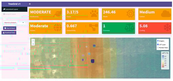 This spatial planning tool, viz. TreeGrid, developed within the R Shiny framework, is characterized by its distinct feature, the careful selection of tree species traits to develop ecological indices and compute relevant values. These traits, including tree height, canopy width, leaf area index, faunal groups, and ecosystem services score, form the basis for several spatially linked indices. A distinguishing feature of the tool is its ability to place trees on a spatial map and generate circles or canopy outlines based on each species’ estimated canopy width. Moreover, an automatic tree placement feature has also been added to the “Autogrid layout” tab. The Autogrid layout offers an automated method for placing trees within a user-drawn polygon. Once the user specifies the species and their intended counts, the tool generates a grid of potential planting points and strategically fills them, ensuring no spatial overlaps. Additionally, we derived mean LST data of the last five years (spatial resolution after resampling was 30 m) for the study area from Landsat 8–9 Thermal Infrared bands, processed via the Google Earth Engine cloud platform.