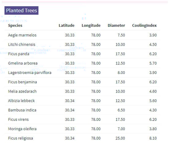 The lists of tree species are also instantly rendered from the Shiny application interface, along with their geospatial coordinates (latitude, longitude), estimated canopy diameter (size, in meters), and associated CI values. These values drive the spatial LST modification and the ecosystem service scoring within the tool (Figure 3).