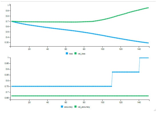 A DNN model was developed to predict bird habitat suitability using the keras library in R []. The training dataset comprised planted tree points with corresponding ecological attributes, including LST (°C), cooling index, shade index, height, and diameter. A binary label indicating the presence of birds was generated by checking whether “Bird” appeared in the biodiversity column and used as the response variable. All predictor variables were normalized, and the DNN architecture consisted of two hidden layers with ReLU (Rectified Linear Unit) activation followed by a sigmoid output layer for binary classification. The DNN was trained for 150 epochs using a batch size of 10, with an 80:20 training:validation data split. The trained model was used to make spatial predictions over the entire study area’s LST raster. The model’s performance across epochs was monitored using the loss and accuracy metrics, with both training and validation curves plotted to visualize learning dynamics and detect potential overfitting trends.