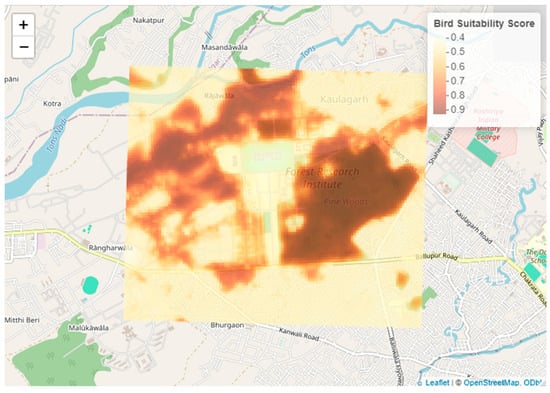 The heat map illustrates the distribution of bird suitability scores across the Forest Research Institute campus and its surrounding areas in Dehradun, India (Figure 5). The scores range from 0.4 to 0.9, with scores below 0.5 indicating low habitat suitability and scores above 0.8 indicating high habitat suitability for birds, as shown by the gradient color bar. Warmer colors, ranging from deep red to brown, highlight areas with higher predicted suitability. These areas often correspond to regions with denser vegetation, larger tree diameters, and favorable microclimates, which are influenced by previous tree placements and modifications in land surface temperature (LST).