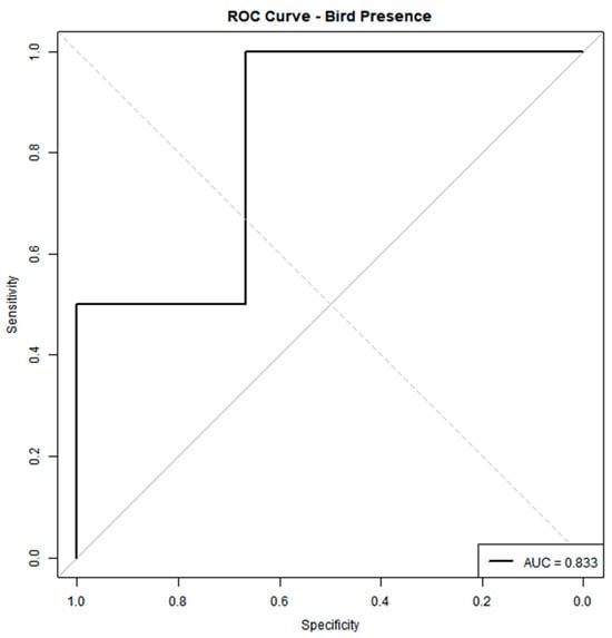 The ROC curve for our DNN classifier (Figure 6) yields an AUC of 0.833, indicating good discrimination between points with and without bird presence. At most thresholds, the model achieves high specificity while maintaining a reasonable sensitivity, as evidenced by the steep rise of the curve toward the upper left corner. In particular, the classifier can accurately identify a large proportion of actual bird presence locations with relatively few false positives. An AUC above 0.8 suggests that our combination of LST, CI, shade index (SI), TH, and CS (diameter) captures relevant habitat signals. However, there remains room to improve sensitivity at lower false-positive rates.