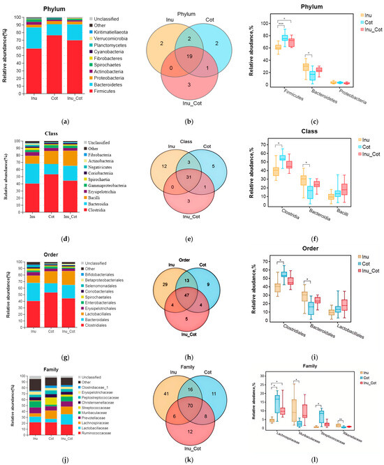 The composition of the top 10 phyla (Figure 3a), classes (Figure 3d), orders (Figure 3g), families (Figure 3j), and genera (Figure 3m) were provided. Results indicated that Firmicutes, Bacteroidetes, Proteobacteria, Actinobacteria, and Spirochaetes were major phyla of fecal microbiota of sows. Firmicutes relative abundance of the Inulin group was significantly lower than that of other groups, and the Bacteroidetes relative abundance was higher than the Cotton Fiber group (p < 0.05). At the class level, the most prevalent microbes were Clostridia, Bacteroidia, Bacilli, Erysipelotrichia, and Gammaproteobacteria. The relative abundance of Clostridia in the Inulin group was lower than in the Cotton Fiber group (p < 0.05), and Bacteroidia was higher than in the Cotton Fiber group (p < 0.05). At the order level, Clostridiales, Bacteroidales, Lactobacillales, Erysipelotrichales, and Enterobascteriales were the main orders in fecal microbiota. The relative abundance of Clostridiales in the Inulin group was lower than in the Cotton Fiber group (p < 0.05), and Bacteroidales was higher than in the Cotton Fiber group (p < 0.05). At the family level, the major fecal microbiota of sows were Ruminococcaceae, Lactobacillaceae, Lachnospiraceae, Prevotellaceae, and Muribaculaceae. The relative abundances of Lachnospiraceae and Streptococcaceae in the Inulin group were lower than in the Cotton Fiber group (p < 0.05), and those of Muribaculaceae and Rikenellaceae were higher than Cotton Fiber group (p < 0.05). At the genus level, the major fecal microbiota of sows were Lactobacillus, Ruminococcaceae_UCG-005, Streptococcus, Christensenellaceae_R-7_group, and Temisporobacter. The relative abundance of Streptococcus and Lachnospiraceae_AC2044_group in the Inulin group was lower than those in the Cotton Fiber group (p < 0.05).