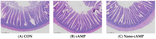 Representative histological micrographs of the jejunum. (A) CON: fed with basal diet; (B) cAMP: fed with basal diet + cAMP 0.02 g/kg; (C) Nano-cAMP: fed with basal diet + 0.37 g/kg Nano-cAMP liposomes. Bar = 500 μm.