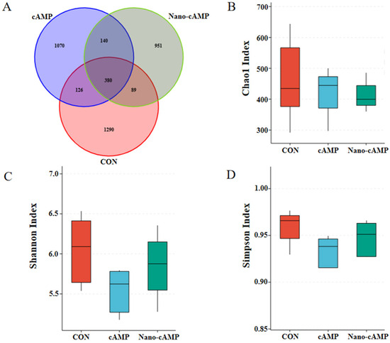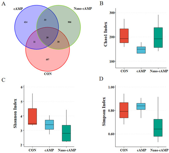 Effect of Nano-cAMP on the alpha diversity of cecum microbiota. (A) Venn diagram of the OTUs distribution; (B) Chao1 Index of alpha diversity of cecum microbiota; (C) Shannon Index; (D) Simpson Index. CON: fed with basal diet; cAMP: fed with basal diet + cAMP 0.02 g/kg; Nano-cAMP: fed with basal diet + 0.37 g/kg Nano-cAMP liposomes.