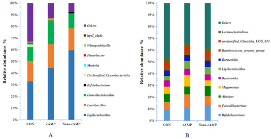 Composition of the microbiota at genus level: (A) jejunal microbiota; (B) cecal microbiota. CON: fed with basal diet; cAMP: fed with basal diet + cAMP 0.02 g/kg; Nano-cAMP: fed with basal diet + 0.37 g/kg Nano-cAMP liposomes.