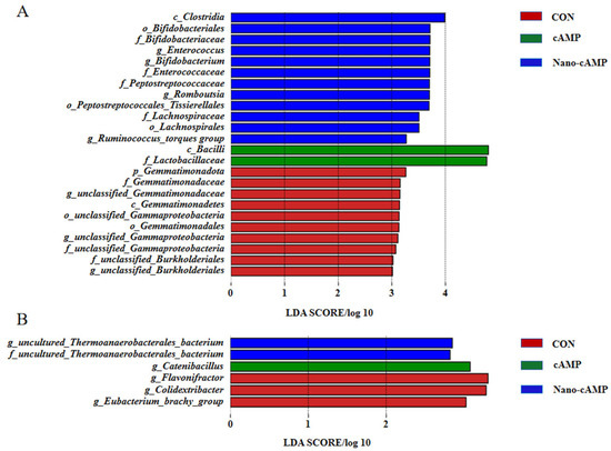 Histogram of linear discriminant analysis distribution of microbiota. (A) Jejunal microbiota; (B) Cecal microbiota. CON: fed with basal diet; cAMP: fed with basal diet + cAMP 0.02 g/kg; Nano-cAMP: fed with basal diet + 0.37 g/kg Nano-cAMP liposomes.