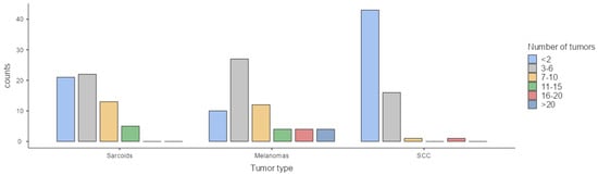 In the literature, preventive measures are described for certain tumor types, and a few participants in this study appear to advise them accordingly [,,,,,,]. However, given the very low percentage of clinicians who reported advising these measures (21.3% for sarcoids and 11.5% for SCC), there appears to be a need for greater education and awareness regarding these preventive approaches.