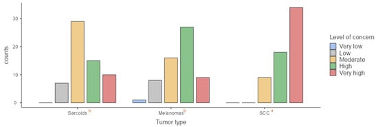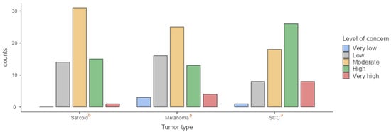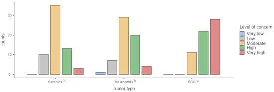 Of the veterinarians, 23% reported that owners exhibit low level of concern regarding sarcoids; 50.8% reported a moderate level of concern; 24.6% reported a high level of concern, and 1.6% reported a very high level of concern. Regarding melanomas, 4.9% reported a very low level of concern; 26.2% reported a low level of concern; 41% reported a moderate level of concern; 21.3% reported a high level of concern; 6.6% reported a very high level of concern. For SCC, 1.6% of veterinarians perceived that owners exhibit a very low level of concern; 13.1% reported a low level of concern; 29.5% reported a moderate level of concern; 42.6% reported a high level of concern; 13.1% reported a very high level of concern. Statistically significant differences were detected in owners’ levels of concern depending on tumor type (Figure 5). Concern was significantly higher for SCC compared to sarcoids and melanomas (p = 0.012; p = 0.001, respectively), but no significant difference was found between sarcoids and melanomas (p = 0.83).