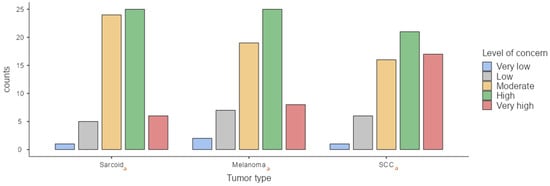For sarcoids, 16.4% of participants reported a low level of concern, 57.4% a moderate level, 21.3% a high level, and only 4.9% a very high level. When evaluating melanomas, 1.6% of veterinarians expressed very low concern, with 11.5% expressing low concern, 47.5% expressing moderate concern, 32.8% expressing high concern, and 6.6% expressing very high concern. Regarding SCC, 18% of respondents reported a moderate level of concern, 36.1% reported high concern, and 45.9% expressing very high concern (Figure 3). Statistically significant differences were observed in level of concern during routine examinations depending on tumor type. SCC raised significantly greater concern (p < 0.001) compared to sarcoids and melanomas, although no significant difference was found between the latter two (p = 0.4).