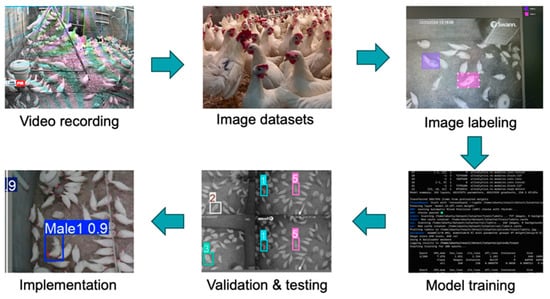 The workflow for hen and rooster detection using the YOLOv5u and YOLO11 models (i.e., data collection, image labeling, training, validation, testing, and implementation).