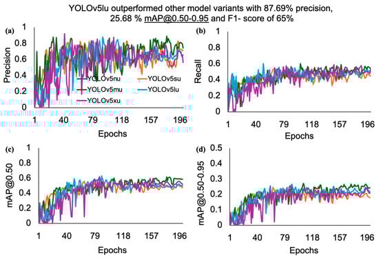 The detailed analysis offers profound insights into the performance of each model, facilitating comparisons across various dimensions. After analyzing the results, it was clear that the YOLOv5xu model outperformed all other examined variants of YOLOv5u, with minimum variations across the performance metrics. A closer inspection of its outcomes showed a notable precision of 88.9%, recall of 77.7%, mAP@0.50 of 82.3%, mAP@0.50-0.95 of 55.6%, and F1-score of 78% as the number of epochs increased (Figure 6). The performance metrics of the YOLOv5u variants increased as the model size increased from nano (n) to large (l) and reached the highest performance at the extra-large (x) variant.