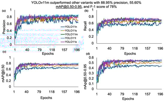 When comparing the performances of the YOLOv11 variants, the YOLOv11m model outperformed all other variants, with small variations across the performance metrics. A closer examination of its outcomes highlighted a precision of 89%, recall of 78.8%, mAP@0.50 of 82.6%, and F1-score of 78% as the number of epochs increased (Figure 7). The performance metrics of the YOLOv11 variants increased as the model size increased from nano (n) to small (s) and reached the highest performance at the medium (m) variant, after which it started to decline from large (l) to extra-large (x) variants. The YOLOv5xu and YOLOv11m variants’ mAP@0.50 score of (82.3% and 82.6%) for rooster detection based on body size further highlights the ability of these models to detect rooster instances with a high confidence score compared with the other variants of the YOLOv5u and YOLOv11 models used. YOLOv5nu exhibited the lowest performance metrics compared to the other variants of the YOLOv5u and YOLOv11 models. It achieved a precision of 79.1%, recall of 61.7%, mAP@0.50 of 62.8%, mAP@0.50–0.95 of 43.2%, and F1 score of 61%. As mentioned earlier, increasing the image datasets (training datasets: 1750 images) and other features, such as body size, significantly increased the detection performance of both the YOLOv5xu and YOLOv11m models in detecting roosters when compared with the performance of YOLOv5lu and YOLOv11x in detecting hens and roosters based on comb size within this study.