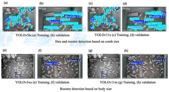 The training and validation prediction results of YOLOv5lu and YOLOv11x during hen and rooster detection based on comb size and YOLOv5xu and YOLOv11m during rooster detection based on body size are presented in Figure 8.