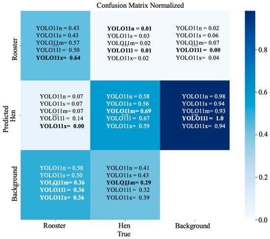 Confusion matrix normalized obtained from the YOLOv11m model during rooster detection based on body size in a CF environment.