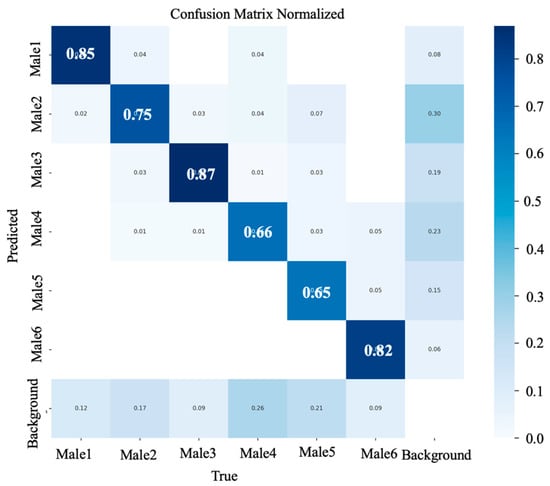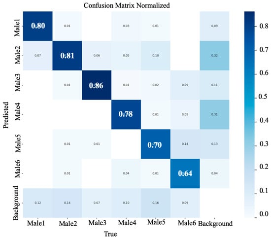 The confusion matrix in the normalized form with the percentage of correct predictions obtained from the YOLOv5xu and YOLOv11m during rooster detection based on body size is shown in (Figure 11 and Figure 12). The YOLOv5xu variant showed the highest true positive rate of 0.87 for detecting Male 3, followed by 0.85 for Male 1, 0.82 for Male 6, 0.75 for Male 2, 0.66 for Male 4, and 0.65 for Male 5. The YOLOv11m variants showed the highest True Positive rate of 0.86 for Male 3, followed by 0.81 for Male 2, 0.80 for Male 1, 0.78 for Male 4, 0.70 for Male 5, and 0.64 for Male 6. These results underscore the proficiency of the YOLOv5xu and YOLOv11m models in accurately detecting roosters in a CF facility. A greater number of true positives indicates better model performance in accurately detecting and recognizing positive instances in the dataset []. This ability can be further improved by integrating rooster data from early life and a larger sample size, which has huge implications for efficient rooster monitoring and highlights the potential of the YOLOv5xu and YOLOv11m models in precise rooster detection.