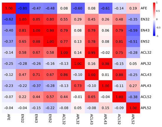 The heritability, genetic, and phenotypic correlations between egg production and clutch-related traits are shown in Table 2. The heritability values of EN during different periods in Lindian chickens in this study were medium (h2 = 0.26–0.34). It can be seen that as the laying period progresses, the heritability of egg production rates shows a slight upward trend. Figure 1 shows the correlation heatmaps for genetic and phenotypic correlations. The genetic and phenotypic correlations were high between EN values at each laying stage, indicating that early laying performance can effectively predict the egg production over the entire laying period. There were strong negative genetic (−0.47–−0.8) and phenotypic correlations (−0.37–−0.62) between AFE and EN during different periods. The EN had relatively higher correlations with ACL (rG(EN32, ACL32) = 0.55; rG(EN32, ACL43) = 0.45; rG(EN32, ACL52) = 0.48; rG(EN43, ACL32) = 0.79; rG(EN43, ACL43) = 0.79; rG(EN43, ACL52) = 0.79; rG(EN52, ACL32) = 0.77; rG(EN52, ACL43) = 0.78; rG(EN52, ACL52) = 0.81), and negative correlations with APL52 (rG(EN32, APL52) = −0.35; rG(EN43, APL52) = −0.59; rG(EN52, APL52) = −0.51). It was observed that EN32 had weak genetic correlations with APL32 and APL43 (rG(EN32, APL32) = 0.29; rG(EN32, APL42) = 0.26).