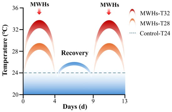 Experimental design of short-lasting and repeatedly occurring MHWs. MHWs-T32: Severe MHW treatment at 32 °C; MHWs-T28: Moderate MHW treatment at 28 °C; Control-T24: Average seawater temperature control at 24 °C.