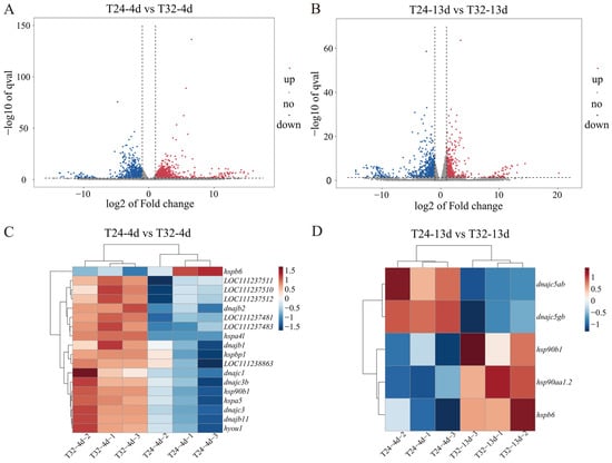 Visual analysis of DEGs in the T24 vs. T32 group. (A,B) Volcano plots of DEGs for T24-4d vs. T32-4d and T24-13d vs. T32-13d, respectively; (C,D) heatmaps showing the expression of HSP genes for T24-4d vs. T32-4d and T24-13d vs. T32-13d, respectively. The heatmaps show the FPKM of DEGs (|log2fold change| ≥ 1 and p < 0.05), which are transformed and normalized. Hierarchal cluster was performed with the method of complete linkage. Red indicates upregulated DEGs, and blue indicates downregulated DEGs in the comparable groups.