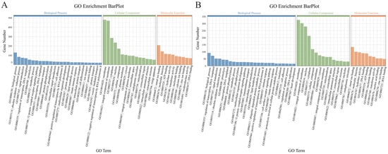 The DEGs from the T24-4d vs. T32-4d and T24-13d vs. T32-13d groups were annotated into three main categories: biological processes, cellular components, and molecular functions (Tables S4 and S5). Within the biological process category, most DEGs were involved in oxidation–reduction processes, signal transduction, and metabolic processes (Figure 3A,B). For cellular components, the majority of DEGs were associated with cell membranes, cellular parts, and organelles (Figure 3A,B). Regarding molecular function, most DEGs in both groups were related to binding and catalytic activity (Figure 3A,B).