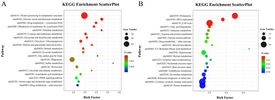 KEGG enrichment analysis of DEGs in the T24 vs. T32 group. (A,B) Bubble plots showing the top 20 most significantly enriched KEGG pathways at T24-4d vs. T32-4d and T24-13d vs. T32-13d, respectively.
