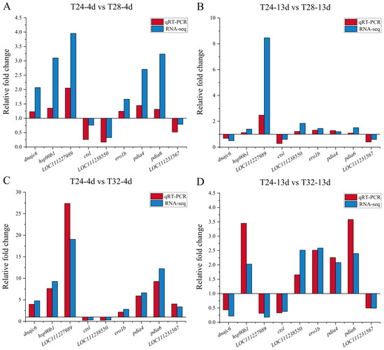 Validation of DEG expression levels using qRT-PCR. The X-axis shows gene names, and the Y-axis indicates the relative fold change between the two groups. The red bars represent the average qRT-PCR values, while the blue bars represent the average RNA-seq values. (A–D) Bar graphs showing the expression levels of genes in the T24-4d vs. T28-4d, T24-13d vs. T28-13d, T24-4d vs. T32-4d, and T24-13d vs. T32-13d, respectively.