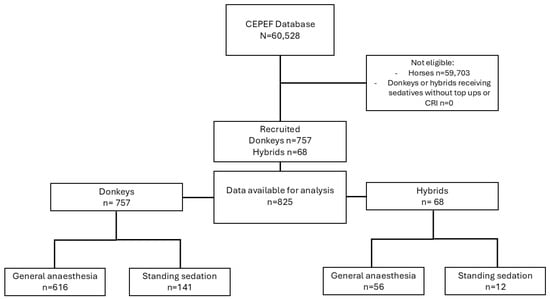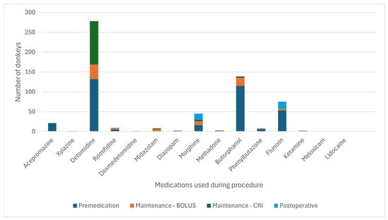 The inclusion criteria were any donkey or hybrid undergoing GA or standing sedation requiring at least one ‘top up’ or a constant rate infusion (CRI) to maintain sedation. Procedures, including surgery or advanced diagnostic imaging (e.g., computed tomography scan or magnetic resonance imaging), were included. Procedures where no surgery occurred or only basic imaging occurred (radiographs, sinoscopy, etc.) were excluded. Cases were collected from all participating locations that saw cases fitting the criteria