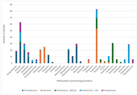 Frequency of the drugs used at each phase of general anaesthesia in 56 hybrids. TLTZLZ: tiletamine-zolazepam; CRI: constant rate infusion.
