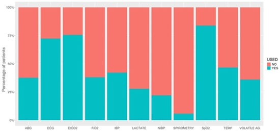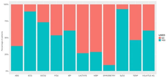 Percentage of patients under different types of monitoring used in 56 hybrids undergoing general anaesthesia. ABG, arterial blood gases; ECG, electrocardiogram; EtCO2, partial pressure of end-tidal carbon dioxide; FiO2, inspiratory fraction of oxygen; IBP, invasive blood pressure; NIBP, non-invasive blood pressure; SpO2, peripheral saturation of haemoglobin with oxygen by pulse-oximetry; TEMP, temperature; VOLATILE AG., inspired fraction and end-tidal concentration of inhalant anaesthetics.