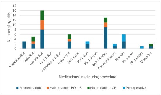 From the 63 collaborating centres, 17 submitted standing sedation cases of donkeys and 6 submitted standing sedation cases of hybrids. The drugs and protocols for the standings and sedations are shown in Figure 7 and Figure 8 and Table 13. Table 14 reports the different CRIs used to maintain standing sedation.