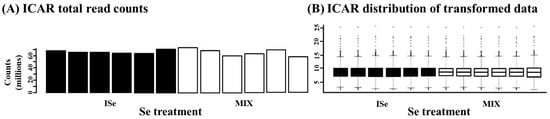 The (A) ICAR total read counts and (B) ICAR distribution of log2 transformed data derived from RNA-Seq analysis for each sample of ICAR tissue from heifers supplemented with a vitamin/mineral mix containing 35 ppm as ISe (n = 6) or a 1:1 mixture of ISe:OSe (MIX, n = 6).
