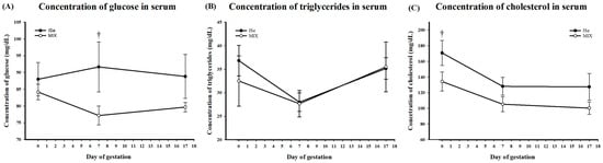 Concentration of (A) glucose, (B) triglycerides, and (C) cholesterol in serum from heifers at estrus (d 0) and gestational d 7 and 17 in heifers supplemented with either ISe (n = 6) or MIX (n = 6). (A) The dietary form of Se (p = 0.03), but not time (p > 0.05), affected serum concentrations of glucose. There was no interaction between the dietary form of Se and time (p > 0.05). (B) The dietary form of Se did not affect serum concentrations of triglycerides; however, an effect of time (p < 0.05) was observed. There was no interaction between treatment and time of systemic triglycerides (p > 0.05). (C) The dietary form of Se (p = 0.01) and day of gestation (p = 0.02) affected serum concentrations of cholesterol; there was no treatment x day interaction (p > 0.05) observed. Data were analyzed as an ANOVA with repeated measures. A † indicates a tendency to differ at 0.05 < p ≤ 0.01. Comparisons represented are between ISe and MIX at each indicated time point.