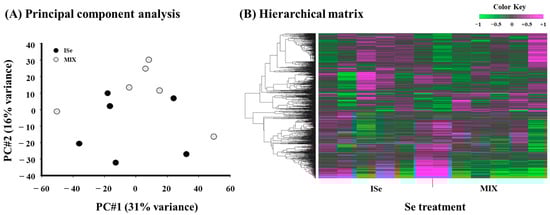 To evaluate the relative relationships and variation among individual heifers, principal component analysis (PCA) of RNA-Seq data was performed. The score plot (Figure 4A) reveals that principal component 1 (PC#1, x-axis) explained 31% of variance among the samples and principal component 2 (PC#2, y-axis) explained 16% of variance. Results indicate that the ISe-supplemented heifers are less closely clustered than the MIX. Hierarchical clustering analysis of the DEGs (Figure 4B) revealed a considerable separation between treatments (ISe versus MIX), but there may be some overlap in transcriptomic profiles of the ICAR, consistent with PCA results.