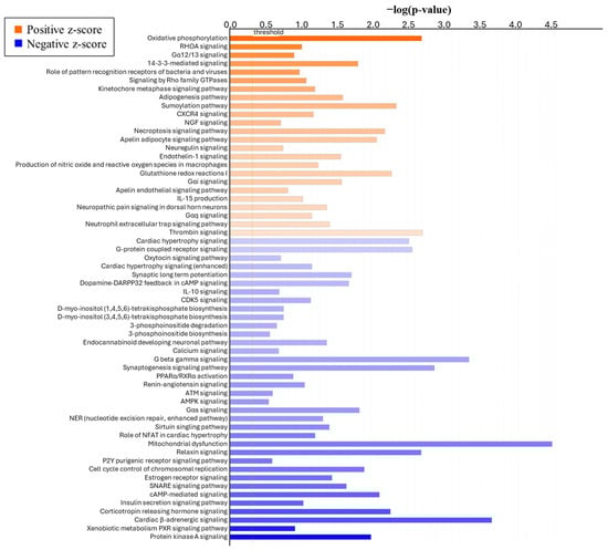 Top canonical pathways of genes differentially expressed from ICAR of heifers supplemented with either ISe (n = 6) or MIX (n = 6) in their vitamin/mineral mixes, as identified by IPA. Pathways are ranked by z-score, with orange (positive z-score) indicating a pathway that is predicted to be upregulated and blue (negative z-score) indicating a pathway that is predicted to be downregulated.