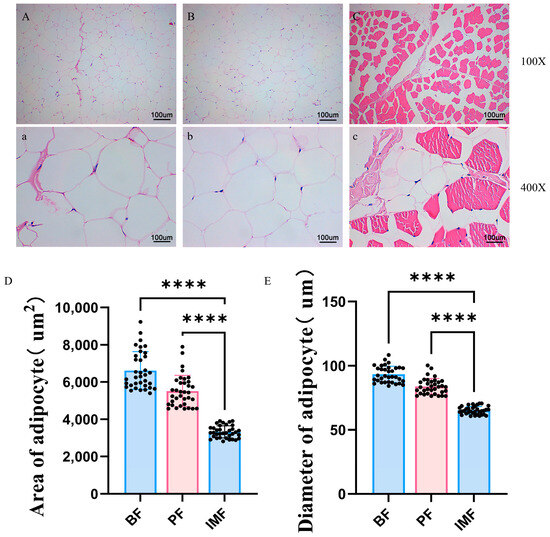 Hematoxylin–eosin (HE) staining of adipocytes in TPs. (A,a) Images of the BF tissue sections of TPs under 100× and 400× magnifications, respectively. (B,b) Images of the PF tissue sections of TPs under 100× and 400× magnifications, respectively. (C,c) Images of the IMF tissue sections of TPs under 100× and 400× magnifications, respectively. (D) The ratio of fat area. (E) The ratio of fat diameter. The asterisk (****) denotes a statistical difference between groups (p < 0.05). The sample size N ≥ 3.