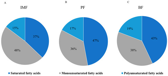 Percentage of fatty acids in different parts of TPs. (A) Percentage of fatty acid composition in IMF, (B) Percentage of fatty acid composition in PF, (C) Percentage of fatty acid composition in BF.
