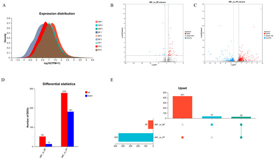 Number of differentially expressed mRNAs in TPs in IMF, BF, and PF. (A) Expression distribution of samples, (B) volcano plot of IMF vs. BF, (C) volcano plot of IMF vs. PF, (D) statistical table of differential genes between groups, and (E) gene set upset diagram analysis.