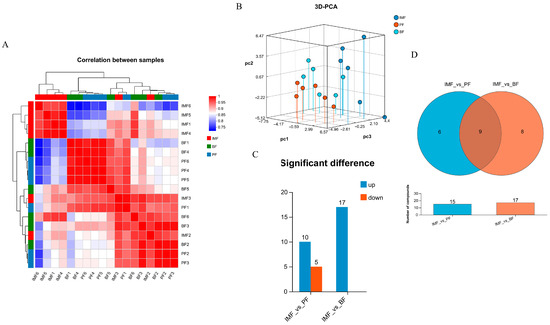 The sample correlation heatmap and 3D-PCA revealed the degree of correlation among different samples of TPs as well as the overall differences within groups, facilitating quality control (Figure 5A,B). In TPs, when comparing IMF with BF, a total of 17 metabolites were screened, all of which were upregulated, including L-glutamine, L-tyrosine, Inosine, 2-hydroxycinnamic acid, etc., and no downregulated metabolites were detected. For the comparison between IMF and PF, a total of 15 metabolites were screened, among which 10 metabolites were upregulated, such as creatine, L-glutamine, inosine, etc., and 5 metabolites were downregulated, including LysoPC (17:0), phosphocholine, 13-hydroxy-9-methoxy-10-oxo-11-octadecenoic acid, etc. (Figure 5C). A total of nine common differential metabolites were screened from these three types of fat, namely, LysoPC (17:0), L-carnitine, 3-guanidinopropanoate, L-tyrosine, LysoPC (18:0), and so on (Figure 5D).