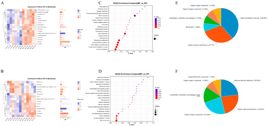 Differential metabolomic analysis. (A) VIP analysis outcomes of metabolites of IMF vs. BF. (B) VIP analysis outcomes of metabolites of IMF vs. PF. (C) KEGG enrichment analyses of metabolites of IMF vs. BF. (D) KEGG enrichment analyses of metabolites of IMF vs. PF. (E) HMDB compound classifications of metabolites of IMF vs. BF. (F) HMDB compound classifications of metabolites of IMF vs. PF (* p < 0.05, ** p < 0.01, *** p < 0.001).