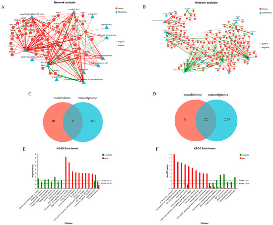 Transcriptomic and metabolomic integrated analysis. (A,B) Correlation network analysis of IMF, BF, and PF. (C,D) Venn diagram of KEGG pathway annotation analysis of IMF, BF, and PF. (E,F) Bar chart of KEGG pathway enrichment analysis for IMF, BF, and PF (figures (A,C,E): IMF vs. BF; figures (B,D,F): IMF vs. PF).