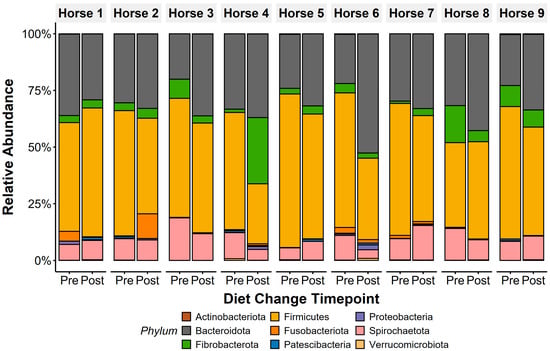 Faecal microbiota composition of all horses was dominated by anaerobic bacterial phyla, with Firmicutes and Bacteroidota presenting the highest abundance in both sample types. Other anaerobic taxa, including Fibrobacterota, Spirochaetota, and Fusobacteriota, were additionally identified pre- and post-diet changes. Only phyla with >0.1% mean relative abundance are displayed.