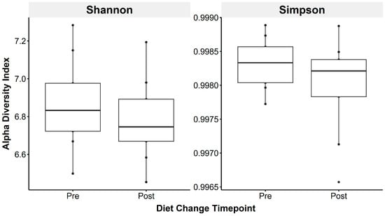Faecal microbiota alpha diversity metrics were not significantly altered by transitioning horses to a low-starch diet, using the Shannon (left) and Simpson (right) indices, reflecting species richness and evenness.