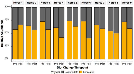 Alpha-diversity and β-diversity metrics remained stable between sampling timepoints. As all horses were deemed clinically healthy throughout, pronounced microbiota dysbiosis was not expected, and the lack of diversity shifts post-diet change was anticipated. However, the F/B ratio decreased after diet change (pre: 2.07 ± 0.21, post: 1.29 ± 0.14), approaching values reported in healthy horses [23]. Elevated Firmicutes and F/B ratios have been linked to gastrointestinal disease [23], doxycycline treatment [82], and obesity [83,84] in humans and horses. Although no standardised healthy F/B threshold exists in equids [84,85,86,87], our findings indicate faecal F/B ratios show potential as a non-invasive microbiota marker of gastrointestinal health.