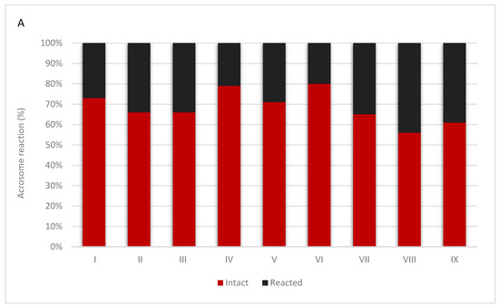 Results of the acrosome reaction in refrigerated semen (A) and frozen/thawed semen (B) collected from nine individuals. The value of intact and reacted spermatozoa of each individuals are shown as a percentage.