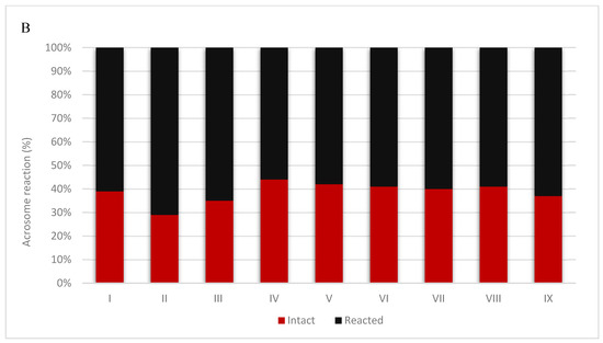 For each stallion, sperm motility (total and progressive) was assessed both in chilled semen (before cryopreservation) and after cryopreservation and thawing of the straws, just before starting the procedure to determine the level of acrosome reaction. The results are presented in Table 1. Semen cryopreservation resulted in a significant reduction in sperm motility (Pr. ≥ |S| = 0.0156). Significant inter-individual differences were also noted—stallion VI had the best post-thaw sperm motility, while stallions II and IV had the worst post-thaw sperm motility.