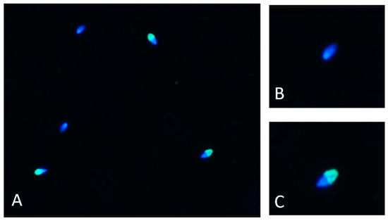 (A) Sample picture of Hucul horse spermatozoa after undergoing the acrosome reaction; green fluorescence shows acrosome intact; blue color indicates acrosome reacted. (B) Sample picture of Hucul horse acrosome-reacted spermatozoon. (C) Sample picture of Hucul horse intact spermatozoon. The images were taken using 100× magnification. DAPI and FITC filters were used.