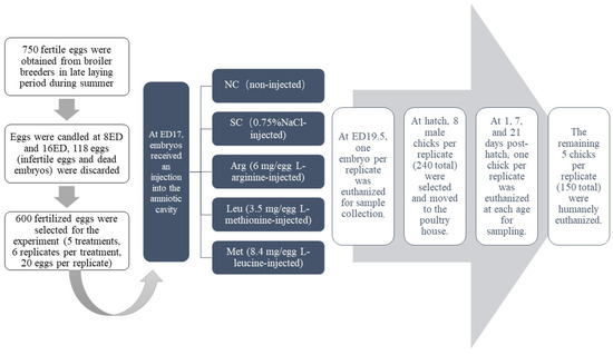 The experimental design process is shown in Figure 1. A total of 750 fertile eggs (average weight: 64.25 g) were collected from 50-week-old LiFeng broiler breeders at a breeding farm in Henan Province, China. The breeder house was maintained at 28–32 °C with 92–97% relative humidity. Eggs were incubated in automatic incubators (2112 type incubator, Limin Comp., Dezhou, China) following the manufacturer’s protocol. Unfertilized and malformed eggs (n = 118) were removed after candling on Days 8 and 16 of incubation. On Day 16 of incubation, 600 viable eggs were randomly allocated to 5 treatment groups with 6 replicates per group (20 eggs per replicate). The 5 treatment groups included the non-punctured control group (NC group); 0.75% saline-injected control group (SC group); 7.0 g/L L-methionine solution-injected group (Met group); 16.8 g/L L-leucine solution-injected group (Leu group) and 12.0 g/L L-arginine solution-injected group (Arg group), amino acid was dissolved in 0.75% NaCl diluent solution. The Arg dosage was selected based on previous experimental results [32,33,34]. The Met and Leu dosages were calculated based on the amino acid balance in eggs [1]. The solution was freshly prepared and heated to 37.8 °C before injection. On day 17.5 of incubation, the amniotic cavity position was determined through candling. A 1 mm-diameter hole was drilled at the air cell end of the egg, and 0.5 mL of solution was injected into the amniotic cavity using a sterilized syringe with an 8-gauge needle. The hole was immediately sealed with paraffin wax. All injected eggs were then transferred to hatching baskets for continued incubation until day 21.