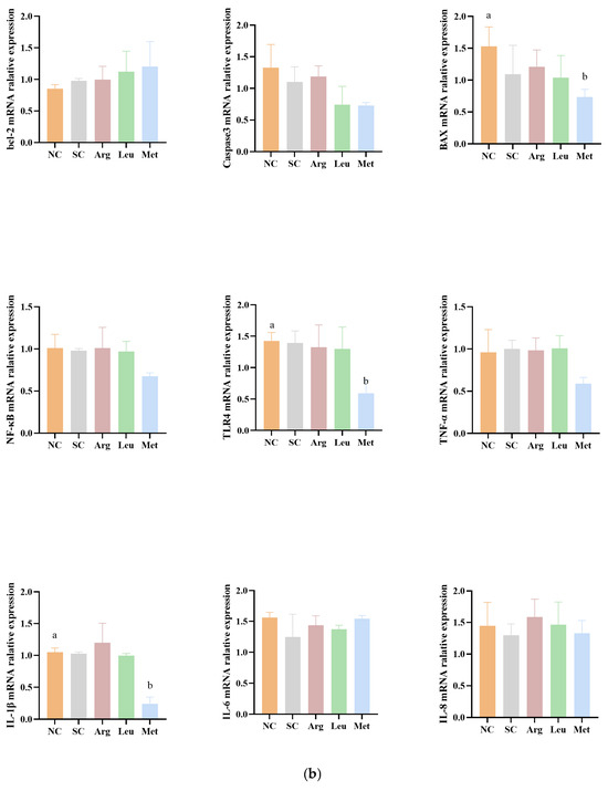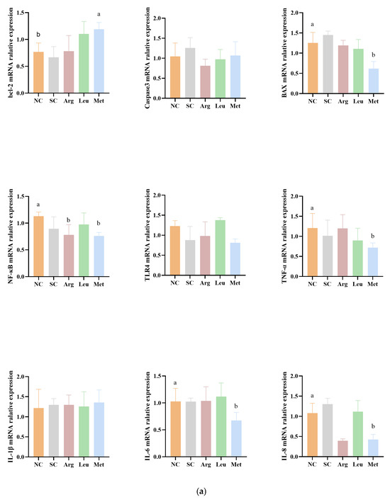 In the figure (a), compared to the NC group, IOF of Arg significantly decreased NF-κB relative expression in the liver at 1 d (p < 0.05). Conversely, IOF of Met not only significantly decreased BAX, NF-κB, TNF-α, IL-6, and IL-8 mRNA relative expression in the liver at 1 d (p < 0.05) but also significantly increased Bcl-2 mRNA relative expression (p < 0.05).