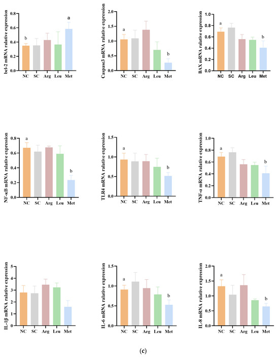 High temperatures readily induce oxidative stress in broilers [39], which is often accompanied by elevated inflammatory levels and the upregulated expression of apoptotic genes [40,41]. These processes collectively induce tissue damage, predispose to various diseases, and impair growth performance in broilers [42]. In this study, concurrent assessments of oxidative, inflammatory, and apoptotic markers revealed that the Met group demonstrated significant reductions across all three parameters. In contrast, no substantial differences were observed in the Arg and Leu groups compared to controls.