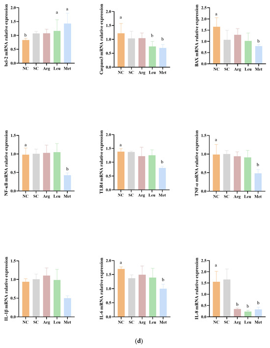 In the figure (d), compared to the NC group, IOF of Arg only significantly decreased IL-8 mRNA relative expression in the ileum at 21 d (p < 0.05); IOF of Leu significantly decreased Caspase 3 and IL-8 mRNA relative expression and significantly increased Bcl-2 mRNA relative expression in the ileum at 21 d (p < 0.05); IOF of Met significantly decreased Caspase 3, BAX, NF-κB, TLR4, TNF-α, IL-6, and IL-8 mRNA relative expression in the ileum at 21 d (p < 0.05), but also significantly increased Bcl-2 mRNA relative expression (p < 0.05).