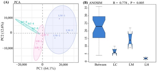 (A) PCA analysis results. Green, purple, and pink circles represent the confidence ellipses for the LC, LM, and LH groups, respectively. (B) ANOSIM analysis. The R value represents the ratio of between-group to within-group differences, with values closer to 1 indicating more pronounced differences between groups. The p value indicates the statistical significance of the difference, with p < 0.05 considered statistically significant. (For interpretation of the references to color in this figure legend, the reader is referred to the web version of this article).